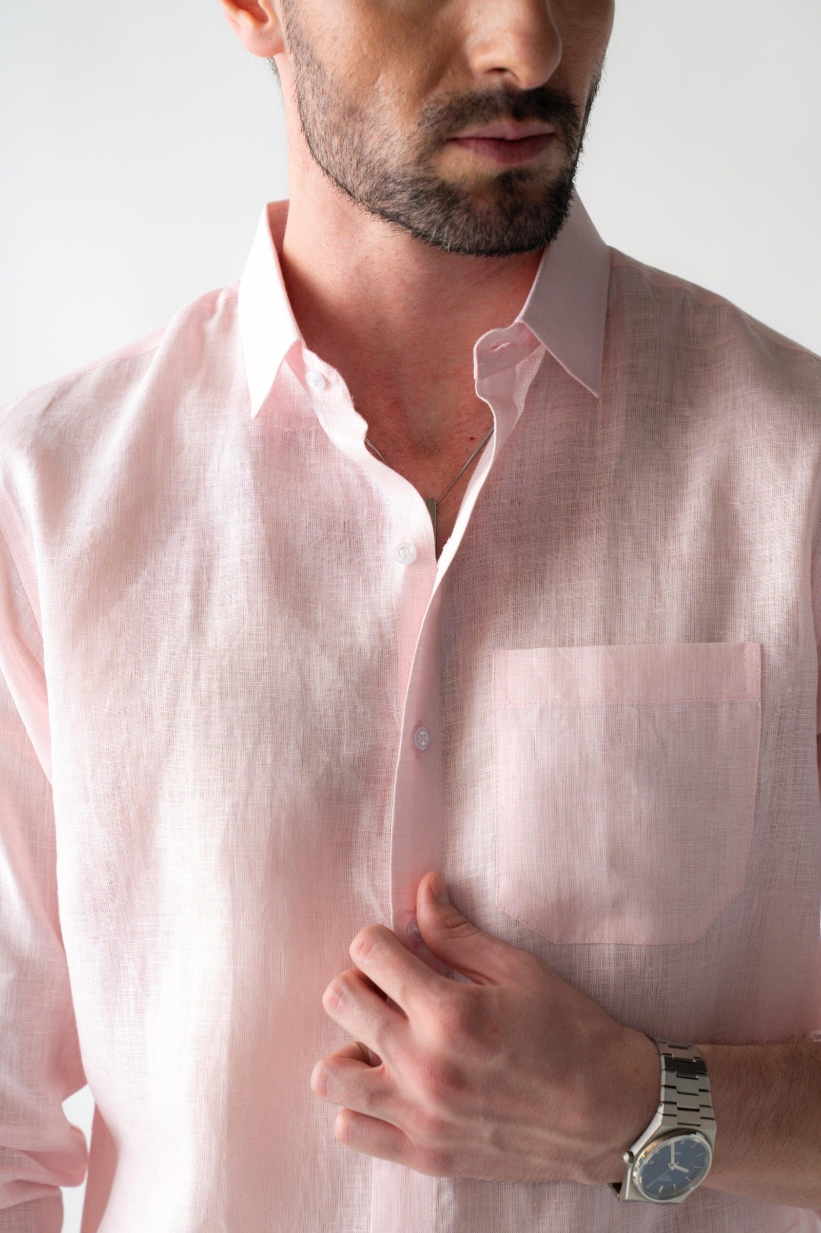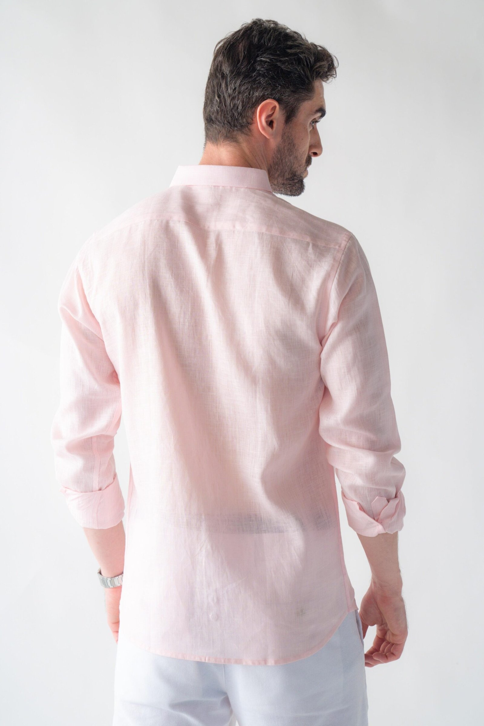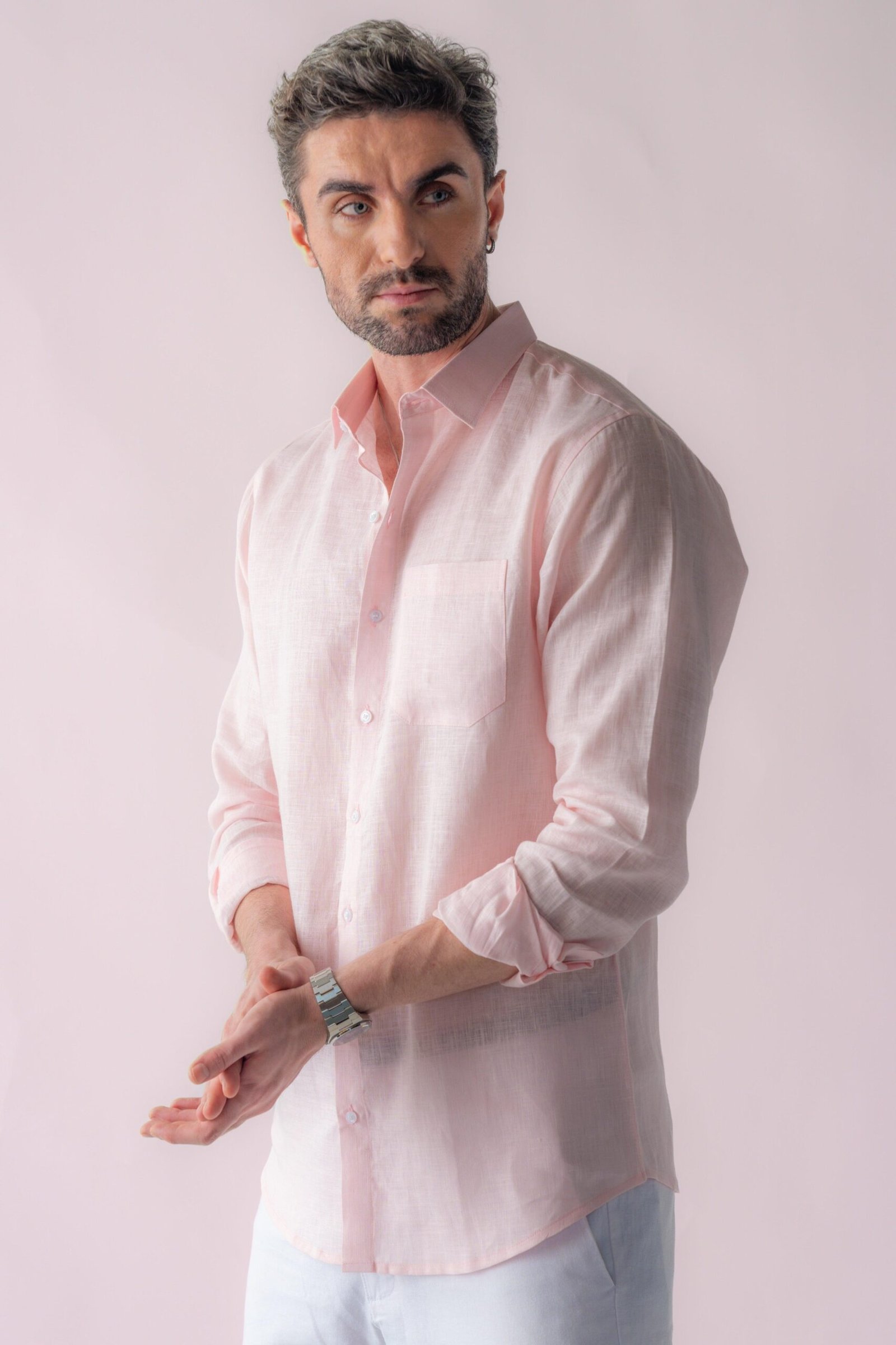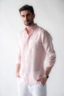 THE LONG-SLEEVE SOFT PEARL PINK SHIRT IS DESIGNED FROM A LIGHTWEIGHT, BREATHABLE LINEN FABRIC ENZYME WASHED FOR EXTRA SOFTNESS, PERFECT FOR ANY SEMI-FORMAL OCCASION