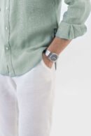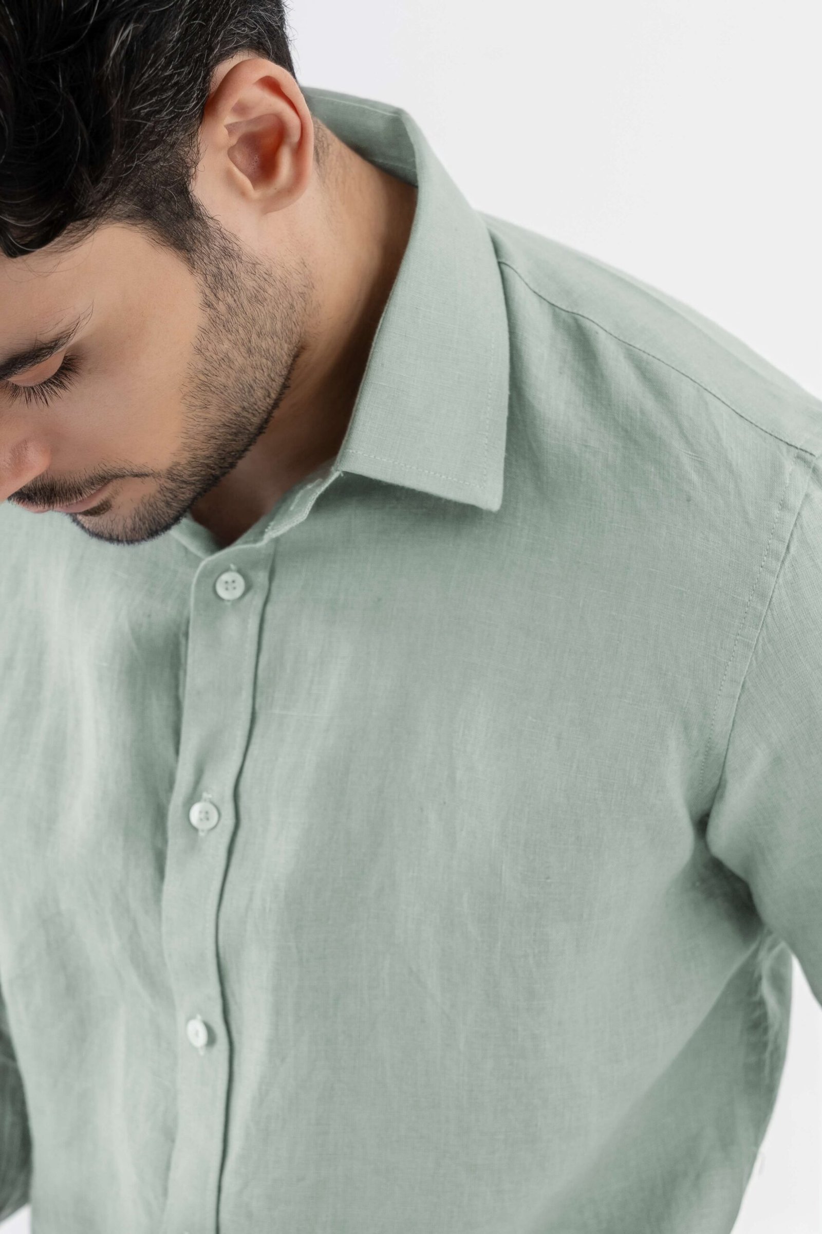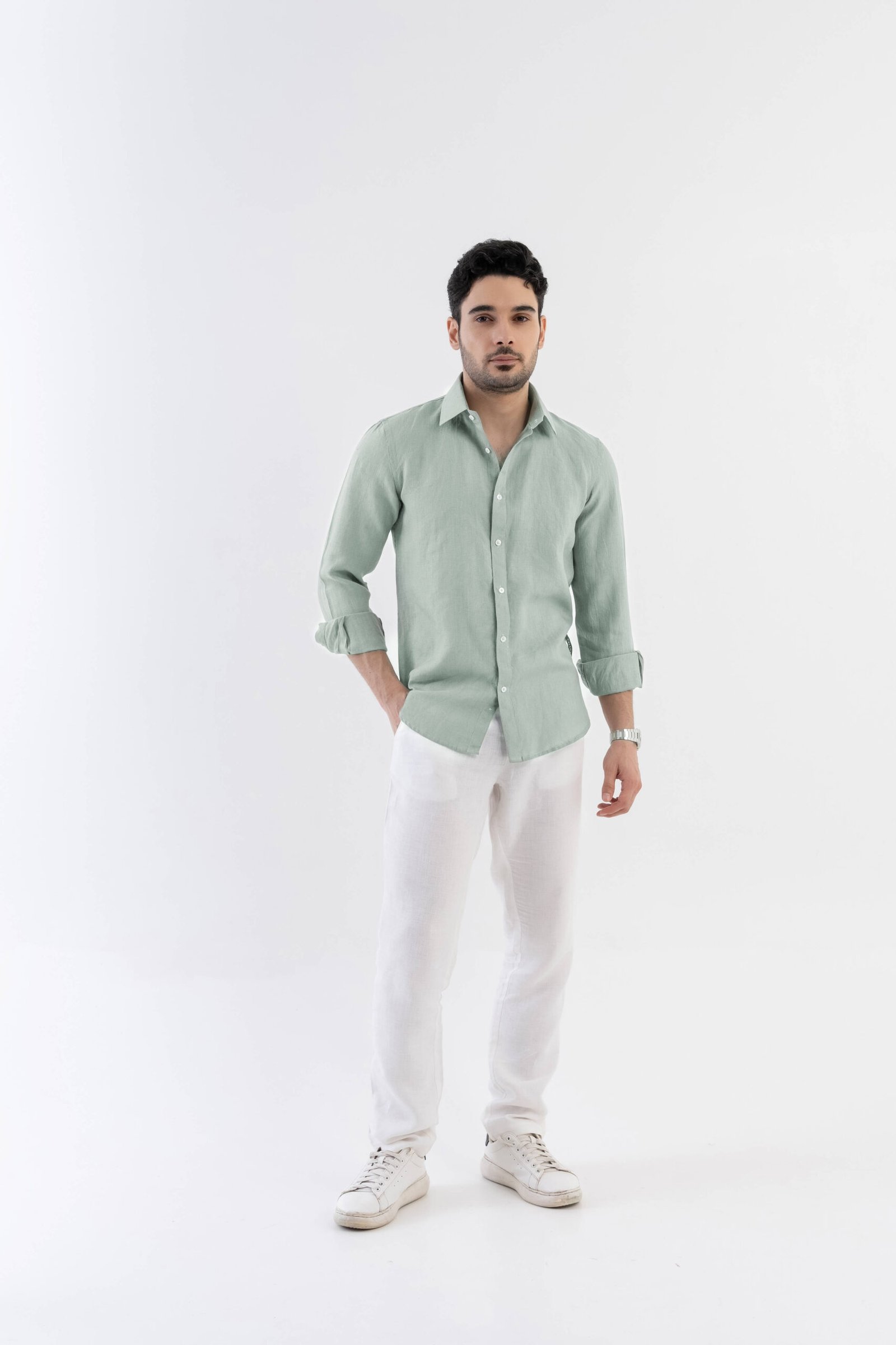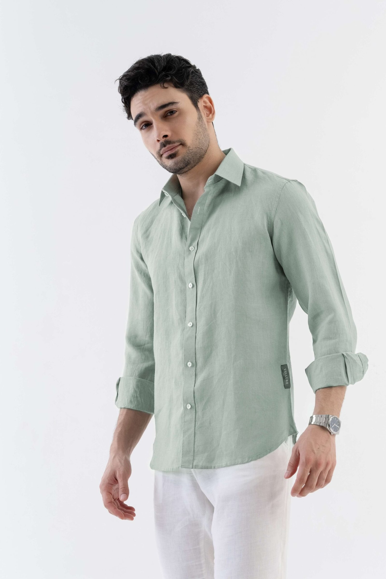 The Long-Sleeve Soft Olive Green Shirt is made from lightweight, breathable 60s lea European linen and enzyme washed for a soft, lived-in feel—perfect for semi-formal settings or easy evenings out.